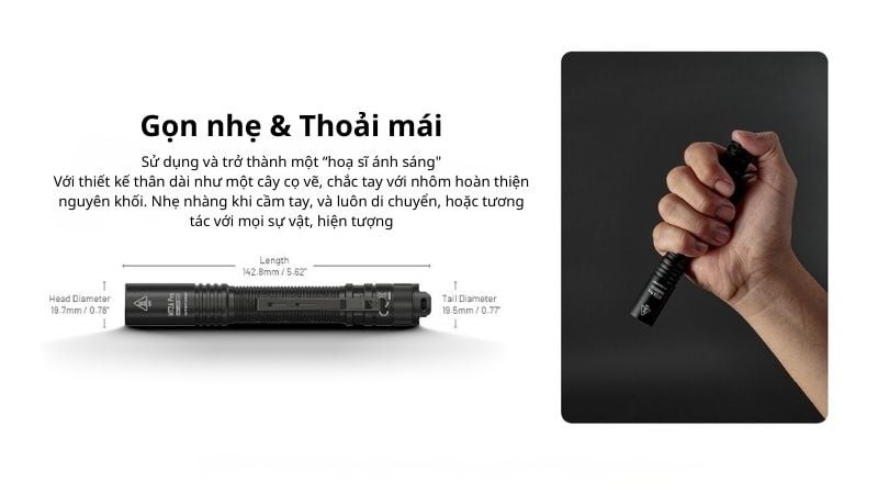 Thiết kế mang tính phổ thông, nhẹ - gọn cho những giải pháp mang đồ thường ngày. Tính năng chỉ có 03 mức sáng CAO - TRUNG BÌNH - THẤP cơ bản cho mọi đối tượng người dùng. Ngoài trời tới trong nhà, với khả năng xử lý chất lượng ánh sáng cực cao tới từ Nitecore.