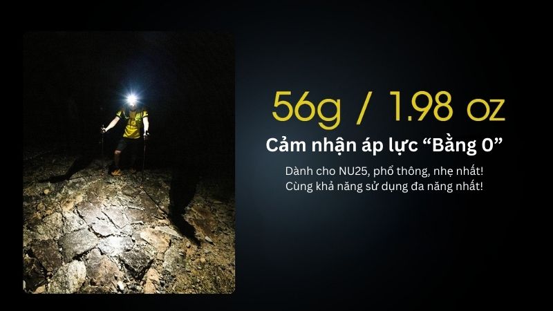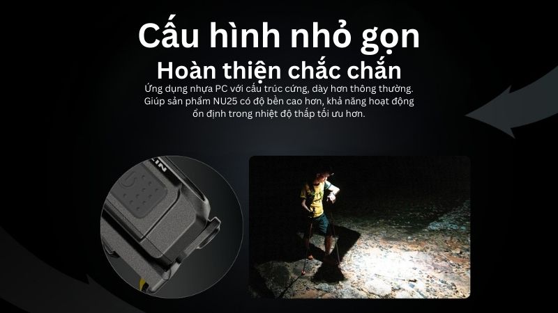 NU25 là một sản phẩm siêu nhẹ, siêu tiện tới từ Nitecore. Một sản phẩm thể thao cao cấp được hãng hoàn thiện với nhựa PC. Thành phần giúp sản phẩm có được một trọng lượng chưa tới 50 gram. Một trọng lượng lý tưởng cho những trải nghiệm nhẹ nhàng, linh hoạt trong từng bước chạy, mục tiêu tập luyện cá nhân.